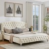 Elevate your bedroom with this stylish king size velvet platform bed—its tall curved wingback headboard delivers grand luxury, paired with artisanal handcrafted diamond button-tufting, exquisite nailhead trim, and pleated stripes for timeless elegance. The headboard’s flared armrests offer easy support when getting up and avoid bump risks from sharp corners, while the 6.3-inch floor clearance lets you clean underneath effortlessly (perfect for robot vacuums or manual dusting). Wrapped in soft velvet with foam padding, it feels cloud-like soft—great for leaning on while watching movies or sipping coffee—and absorbs turning over or getting up noises to boost sleep quality. Built with high-quality wood slats, a durable iron structure, 6 central legs, and arched metal feet, it supports up to 800 lbs for long-lasting stability (safe even for kids’ play). No box spring is needed, and it comes with a detailed manual + labeled components for hassle-free assembly.