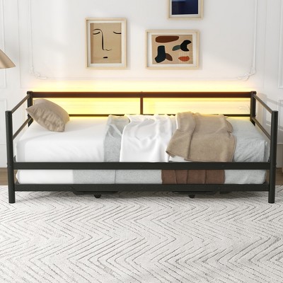 ModernLuxe Twin Size Metal Daybed with LED Lights & Adjustable Pop-Up Trundle, 350LBS Capacity, No Spring Box Needed, Black/White