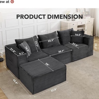Modular Cloud Sectional Sofa w/Ottoman, No Assembly Corduroy Couch, Deep Seat l-Shape Sofa for Small Spaces, 4 Colors & Configurations, Black