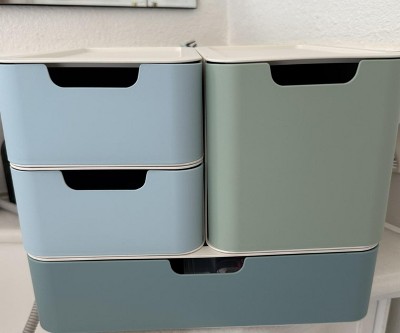 A: You can store craft supplies, notepads, and other essentials in this modular drawer set.