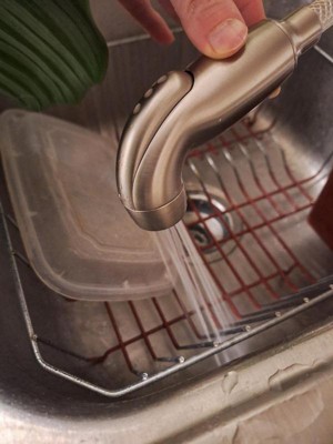 Faucet is just what we wanted. I would have liked a bigger handle for the sprayer. I have arthritis in my hands and if I want to use the sprayer, I have to use 2 hands. The trigger is difficult to push and could have a better design for the sprayer.