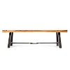 - Offer your outdoor seating ensemble an addition that you will not regret. Our sophisticated slat-panel bench brings a perfect amount of stylish comfort and modern industrial aesthetics to your backyard or patio. Featuring a durable powder-coated metal frame and a finished rich acacia wood top, our bench is an excellent addition to your outdoor decor.