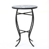 - Bring style and tablespace to your outdoor ensemble with this elegant side table.Whether you want to rest a pitcher of fresh lemonade or display a bouquet of your favorite flowers, this design is the perfect foundation. More than just functional, it showcases a round top with a mosaic-style pattern crafted with blue and white ceramic tiles.It is supported by four iron legs with graceful curves and a neutral black finish.