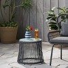 - The perfect boho accent to any patio collection, this glass-topped end table is a unique combination of naturally-textured rope and a rugged iron frame. This versatile selection can serve as a rustic endcap for your favorite outdoor sofa or as a shared place to chat over hot coffee.