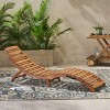 For a unique yet comfortable way to lounge poolside or in your backyard, look no further than this wood outdoor chaise lounge.Recline and put your feet up in a stunning chaise lounge while watching the sunset. With seating made from gorgeous acacia wood, this chaise not only ensures style but also durability with its weather-resistant qualities. Take this to go with its easy foldable design and handle, which allows you to move this piece without the hassle and stress.With its inviting open slat paneling and convenient pre-assembled design, our chaise lounge will complete your outdoor space and have you relaxing in no time.Bring a classic element to your outdoor environs with this curvy patio chaise lounge. This chair is made of solid acacia hardwood for long-lasting durability and quality, and it features a slatted design for airflow and to prevent pooling water. This lounge chair also can be folded up and includes a built-in handle for easy transport.