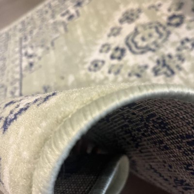 It’s a nice rug, soft and semi-plush. I am not impressed that it does not have the anti slip bottom considering the size and area it would fit. Some of the pattern is difficult to distinguish as the white and blue are so intertwined.