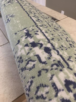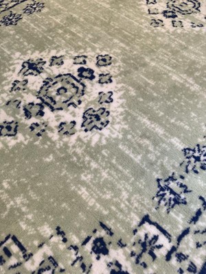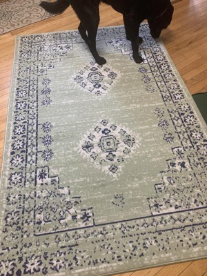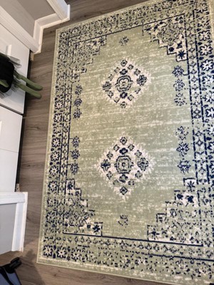 This is a very pretty almost lime green and blue rug. It has a classic Persian style. It isn’t super thick or fancy. The size is great for smaller spaces. It is a good Mohawk rug. It seems to be a good quality as well.