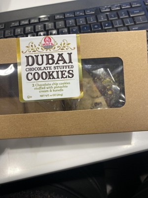 - Soft-baked chocolate chip cookie filled with Dubai pistachio paste