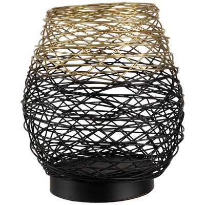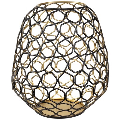 The Danya B. Molta Modern Black Metal Bold Pedestal and Glass Pillar Candle Holder offers a modern and striking centerpiece. The uniquely modern design contrasts the clear glass candle holder pillar with an encompassing rounded black base. Three sleek legs elevate the candle holder atop any table. This elegant candle holder also includes decorative pebbles to place inside the glass pillar and frame your favorite candle. This blend of sleek texture and earth-toned colors helps accentuate the comforting display of any lit candle in your living space. The bold raised pedestal base is also sturdy and solid, ensuring quality construction and stability on your favorite tabletops and shelving surfaces. This elegant candle holder also offers the perfect gift for newlyweds, new homeowners, and any other candle lovers in your life. This stylish and sophisticated Molta metal and glass design is available in both a large hurricane candle holder and a smaller votive candle holder size. These are sold separately but can be paired to add visual interest to any table and accommodate a variety of candles.