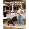 Click the button at the handlebar and the baby stroller folds itself and stands on its own; with a quick pull, it opens smoothly; easy to master in seconds and great for parents who often have their hands full. Measuring only 20.1 x 8.5 x 21.5 inches, this compact stroller easily fits into the trunk of your car and overhead bin of a plane. (*We recommend checking with your airline for specific carry-on requirements before travel.) Steer smoothly in any direction with the 360-degree swiveling front wheels; all-wheel suspension absorbs shock on bumpy roads for a comfortable ride; extendable UPF50+ canopy with vented peekaboo window (If the canopy blocks the baby's face, you can tuck the extension inside, adjustable recline and leg rest, and five-point harness combine to create a cozy and safe haven for baby on the go.