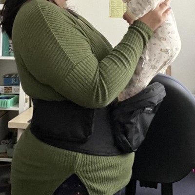 [This review was collected as part of a promotion.] This is a great carrier if you have a little one that doesn't like to be fully confined in a traditional carrier but your back still needs some support. I have a large waist and had no issues getting the belt to fasten around me which was great. The compartment with a zipper is perfect for holding diapers, wipes, snacks, wallet, keys, etc. This carrier has been much easier than trying to get out a stroller when I just need to quickly run into a store with my child. I received an incentive to write this review.