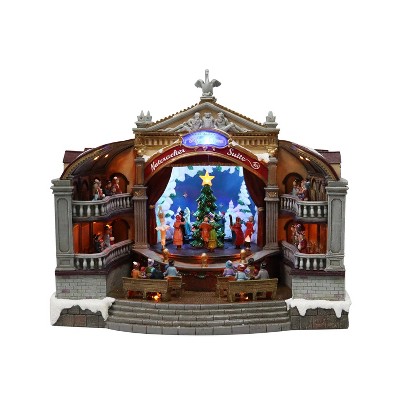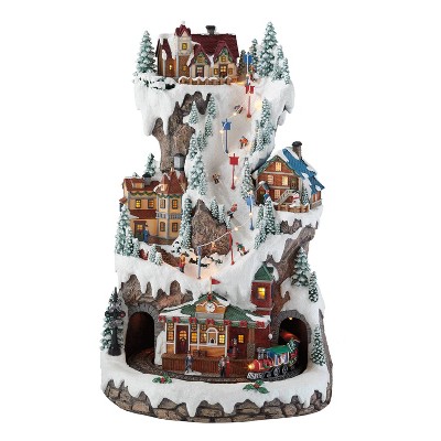 Transform your holiday display with Moments in Time's 14.8""H Animated Tiered Village Town Center. This grand, captivating Christmas village decor piece seamlessly blends LED lights, delightful music, and enchanting animation to create a festive ambiance that captures the spirit of the season. Powered by the included adapter, this table decor features a charming, colorful town center with vintage-style multi-storied buildings, each boasting intricate details and brick roofs. Among these structures, people are bustling in various activities, adding a touch of nostalgia to your Christmas village. The heart of this enchanting display is the tiered town center, featuring an animated glittering Christmas tree that gracefully rotates, adorned with colorful ornaments and topped with a dazzling gold star. Below, an animated train conducted by Santa traverses the tracks, disappearing into tunnels and reemerging with festive charm. Realistic textures and meticulous hand-painting contribute to the overall authenticity of this Christmas village, making it a timeless addition to your festive decor.
