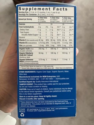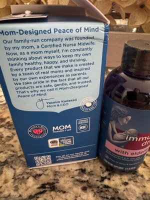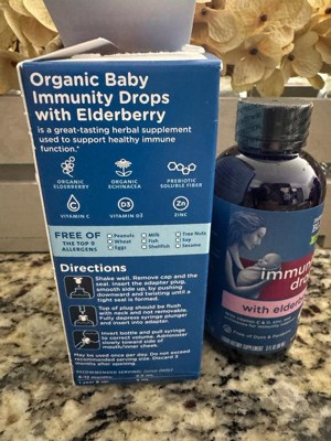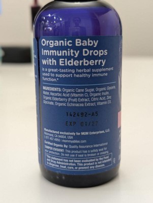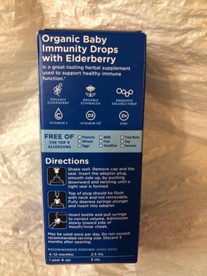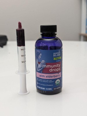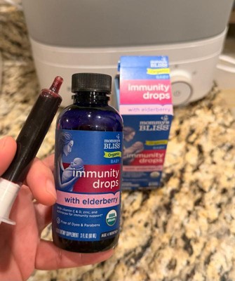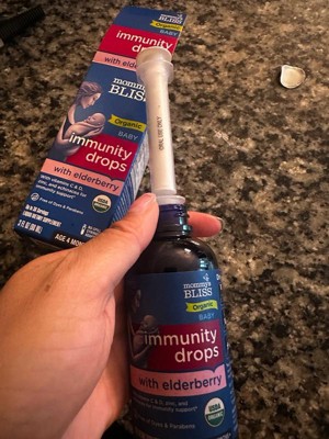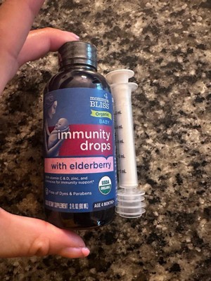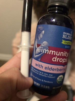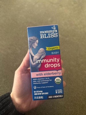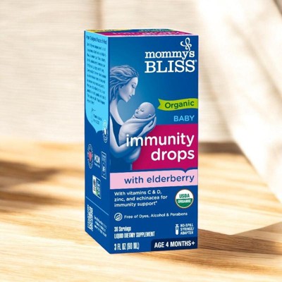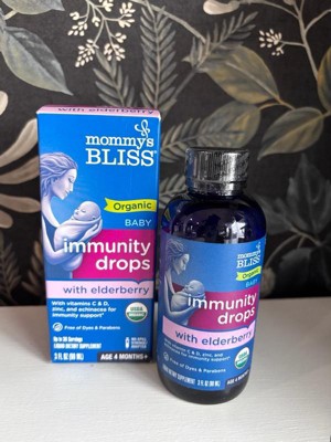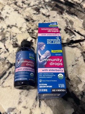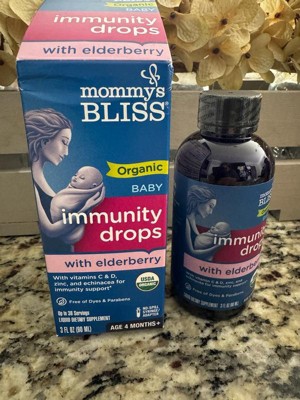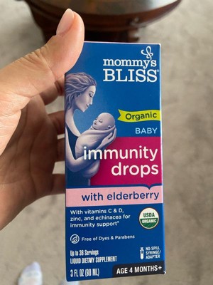 "Mommy’s Bliss Organic Baby Immunity Drops with Elderberry provide yummy, mom-designed immunity support. Crafted with Certified USDA Organic elderberry and echinacea, along with antioxidant-rich Vitamin C, D, and Zinc, our Immunity Drops come with an easy-to-use dosing syringe and are free of dyes, alcohol, and parabens.