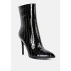 Momoa High Heel Ankle Boots are croc patterned, closed pointed toe boots. These girls boots come with a side zipper for easy access and a lightly padded insole to give your feet, the love of a thousand clouds. These heeled boots will sizzle your look, making heads turn wherever you go. Once you own them, the boots are sure to become the apple of your eye. Outer material: Patent PU Lining Material: Synthetic Outer sole: TPR Closed Pointed Toe Pointed Heeled Boot Side Zipper Opening Women High Heeled Boots Croc pattern SH3446
