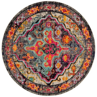 Featuring a captivating design that melds traditional patterns with a contemporary color palette, this round rug showcases an artful mix of light grey hues complemented by vibrant multi-colored accents, creating a dynamic and inviting atmosphere in any room.