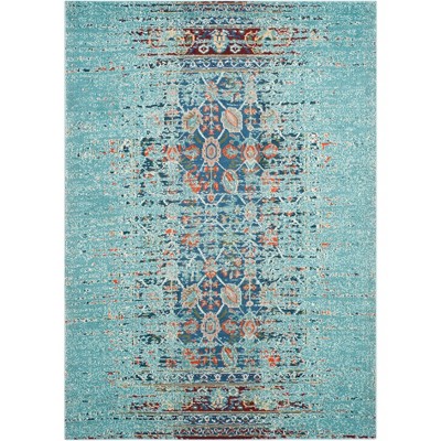 Transform your space with this captivating area rug. Measuring 6 feet 7 inches by 9 feet 2 inches, this medium rectangle rug fits perfectly in any room. Its blue and multi-color design brings an artistic touch with a hint of Bohemian style. Expertly power loomed in Turkey, the rug combines 57 percent polypropylene, 30 percent cotton, and 13 percent polyester, offering a blend of comfort and durability. Its low profile, with a height of 3/8 inch, ensures a sleek look that suits various decor styles. Add a touch of elegance to your home with this versatile accessory.