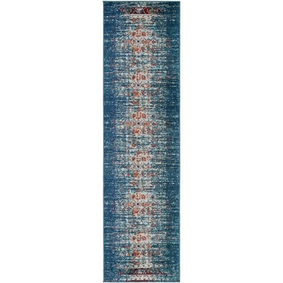The rug features a dynamic, bold pattern with hues of red and blue at the forefront, accented by touches of multiple colors that create a harmonious yet spirited palette. This beautifully designed runner will seamlessly integrate into a variety of decors, bringing a blend of traditional and contemporary style to your home.