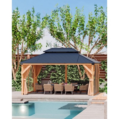 Mondawe 10x12Ft. Outdoor Solid Wood Frame Patio Gazebo Galvanized Steel Hardtop with Netting