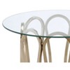A light and airy ambiance offers elegance and taste. This charming end table plays on an artistic theme and blends beautiful materials. A round glass top perfects the contemporary theme you're after. Enjoy a decorative base with shaped pieces in a warm chocolate chrome finish that capture attention. Add a delightful accent to a modern living area with this tasteful end table.