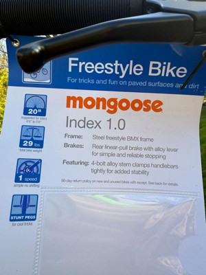 [This review was collected as part of a promotion.] I received this bike for free in exchange for my opinion. The Mongoose Index 1.0 Boys’ 20” Freestyle BMX Bike is a solid, durable bike that’s perfect for kids who love ramps, rails, and trying new tricks. The single-speed drivetrain keeps things simple, and the alloy linear-pull brake gives reliable stopping power. My son’s favorite part is the four freestyle pegs, gives it a BMX setup feel. It was easy to assemble by a few boys with basic tools, and the 20-inch wheels are a great fit for big kids. Overall, it’s a sturdy, fun bike that can handle plenty of rough-and-tumble riding.