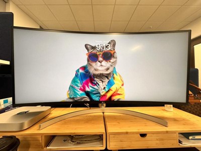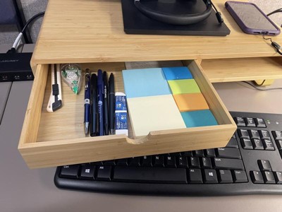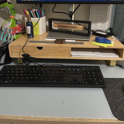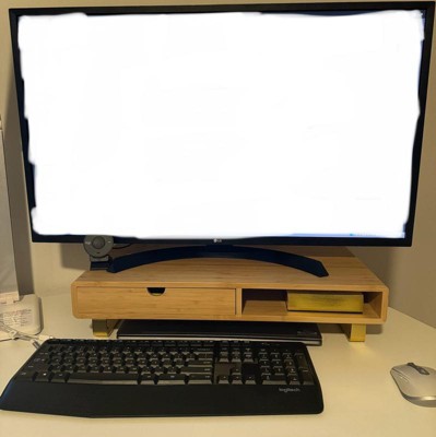 - Wood monitor riser with woodgrain finish