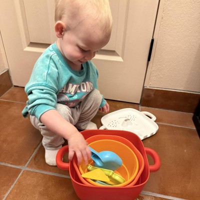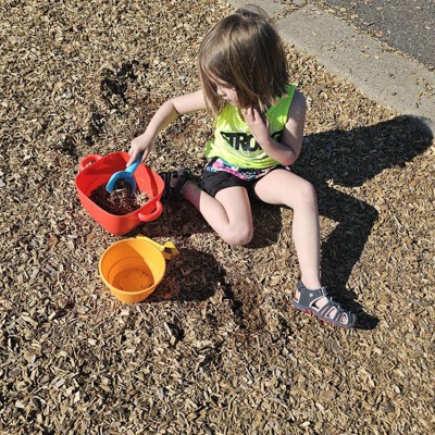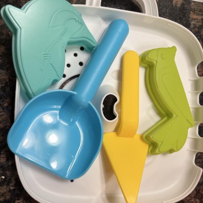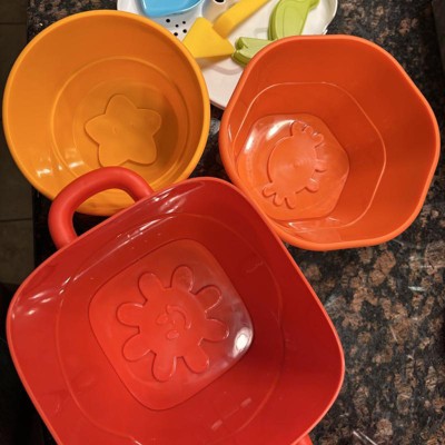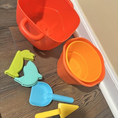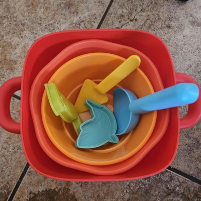 [This review was collected as part of a promotion.] This is an excellent little sand set for little ones! It has the sand necessities like buckets, molds, and scoops, but unique in the way that the buckets also double as a nesting set. That’s perfect for toddlers but also convenient for storage. The buckets also have molds which are super adorable and the little lid for the container acts like a sifter. The plastic seems pretty durable and the bright colors are perfect for kids. I think this is a perfect little sand set for little ones! My 18 month old loves it! I received an incentive to write this review.