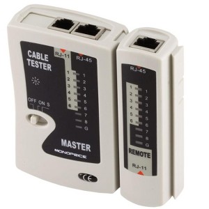 This Monoprice RJ11/RJ45 tester is a simple, yet powerful, tool that helps troubleshoot network and telephone cables for broken wires and crossed connections.The tester consists of a main Master unit and a detachable Remote unit, each of which have an RJ11 and an RJ45 jack. The unit is powered with a 9-volt battery (not included) and can be stored in the included, zippered, synthetic leather case.The Master and Remote unit each have a series of 9 LEDs that show the status of each line on the attached cable. The tester supports both a fast automatic and a slow automatic mode.