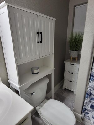 Our stylish RiverRidge Monroe Over the Toilet Space Saver Bathroom Medicine Storage Cabinet with Adjustable Shelf is the ultimate over-toilet cabinet solution for maximizing space. Its vertical inset styling and matte black handles create a clean, modern look while providing storage for your bathroom essentials. Featuring one adjustable shelf and one fixed shelf behind double doors, plus an open shelf below, this towel cabinet for the bathroom offers versatile bathroom wall storage options. Keep toiletries neatly tucked away or display decorative accents on the open shelf. With its classic design and soft-close doors, this over-the-toilet cabinet adds both style and function to your space. This bathroom or kitchen wall cabinet is designed to fit over most standard toilets with a toilet clearance of 22.5 in. W x 7.94 in. D x 32.44 in. H. Easy-to-follow assembly instructions and wall-anchoring brackets ensure simple installation of these stylish wall cabinets.