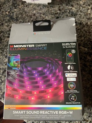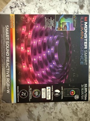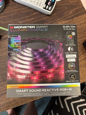 Backlight any area with the Monster Smart Sound Reactive Multi-Color Multi-White LED Light Strip with Remote. This 32.8ft LED Light Strip is the perfect item for adding ambiance to your indoor environment. Use the included IR remote control to create and customize the perfect aura for any occasion. It can be easily added to any space by using the built-in adhesives to mount the light strip on any flat, clean surface in your livingroom. Use the included wall adapter to create dynamic lighting for your HDTV or a computer! The Monster Sound Reactive Multi-Color Multi-White LED Light Strip technology is easy to install and sure to satisfy & bring a pop of color to any space!