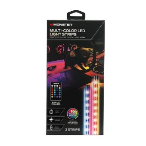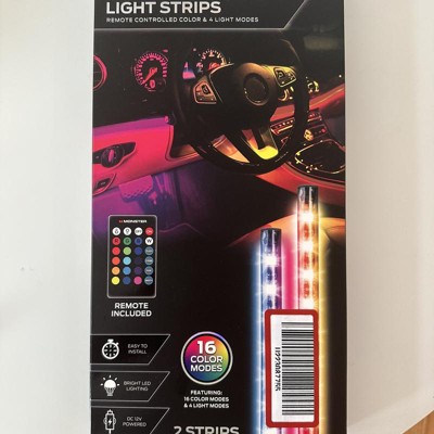 The Monster Multi-Color LED Light Strips 2 Pack will customize and illuminate your car with bright, high quality LED lights and provide an interior ambient glow. Installation is quick and easy, simply use the self-adhesive tape on the back of the strips and apply to the interior dash, floor, or under the seats. The easy ‘Connect and Glow’ strips plug directly into your car’s DC 12V port and use the wireless remote to control the color and fades. The light strips feature 16 color modes and 4 light modes (strobe, fade, flash, and smooth). Two multi-color LED light strips included, each strip measures 10.75” long.