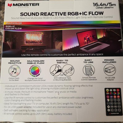 [This review was collected as part of a promotion.] The Monster - IR 5m RGBIC strip was so easy to install. I decided I wanted to stick it to the back side of my wall mounted TV. I was able to attach the strip without issue and it was simple to cut to the length I needed for my TV. I love that this strip is sound reactive. It makes the whole mood of the room change with the sound. I like that this strip is powered vs battery operated because I believe powered produces better quality effects and better reaction time. I think having a remote to operate the strip is very convenient and it works great. This is a wonderful addition to our TV watching experience.