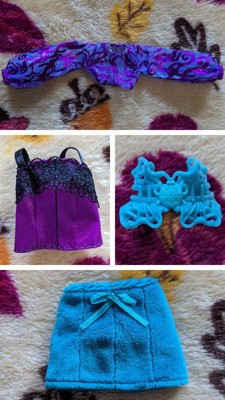 [This review was collected as part of a promotion.] This doll is so cute! She has a teal and darker purple color scheme that suits her so well. The makeup around her eyes is a smokey purple and includes butterflies and her lips are a shimmery purple. Her hair is mostly purple with teal streaks and has a side part with low pigtails. Straight out of the packaging she comes wearing a purple mini dress that has flowers and the Monster High Skullette, a blue plastic corset, purple platform heels, and strangely black netted... socks? Leggings? It seems these are meant to be socks but were cropped for some reason. Honestly I don't like them this way because they do not sit at the right placement on her legs and don't work well with her purple shoes (see photo) but seem okay with her other pair. It feels cheap to me, the artwork on the instructions even shows them as full length socks. She comes with several extra pieces of clothing and accessories including: a purple satin tank top with black straps and lace at the top, a velvety teal paneled skirt with a ribbon bow, a sheer long sleeved purple blouse with foil details, a plastic teal corset with a bed bug detail in the center that is painted a slightly different shade, a pair of purple platformed high heel shoes that have a quilted texture with three buttoned straps across and a stack of books as the heel, a pair of teal boots with cutouts in a spider web theme and a dangling bedbug/spider as the heel, translucent teal dangle earrings with flowers, a purple handbag styled as a house with a blue bunny shaped door and other really cute details all around and inside as it also opens up, a purple teacup on a saucer with spiderweb details and wispy steam that comes up and forms a bunny shape, next is a multi-part set that includes a gray serving tray with bones as handles and spiderweb details, tongs, a cookie shaped like a ghost bunny and an intricately detailed cookie house with painted ghostly details that can connect to the tray and bunny cookie. We also get the other parts that come with all of these locker sets including two hangers, a closet pole, two different waist clips, one for the elevator and the other for the front of the locker, the three pieces to build the elevator lift, the key to open the locker, the instruction sheet and of course the locker itself. Overall my kids and I are very pleased with this one, my main gripe being that the socks feel cheap.