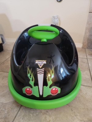 Watch your kids have fun riding around indoors and outside in the Monster Jam Bumper Car. This 360 degree spinning bumper car features a two-point safety belt to protect your child while riding. The addition of rubber bumpers provide extra protection from the side and preventing damage to indoor furniture and walls. The bumper car has four durable wheels that work in various conditions including concrete, tile, and most other flat surfaces. The 6V battery charges quickly and provides up to 45 minutes of run time. With a top speed of 1.8 miles per hour, your child will have fun riding, while you are easily able to catch up and stop them if needed. With two control modes - steering wheel and separate remote control - you can let your child have fun inside while guiding them outside.