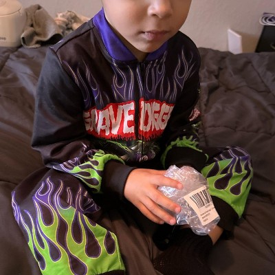 Gear up for nonstop fun in this officially licensed Monster Jam Grave Digger racing coverall! Styled like a real race car driver's suit, this zip-up one-piece features bold graphics, ribbed cuffs, and a mock neck for extra flair. Made from soft, durable fabric, it’s built for movement and imagination—perfect for playtime, dress-up, or cozy Halloween nights with big truck energy.