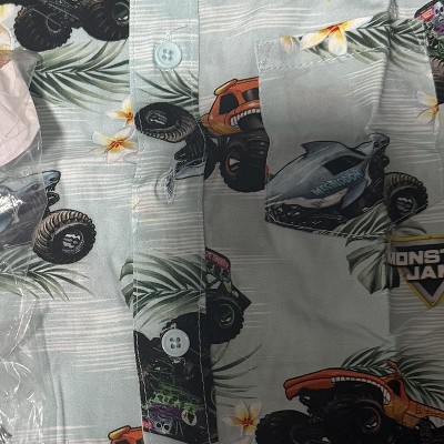 Get ready to match in style with these officially licensed Monster Jam Hawaiian shirts, featuring bold all-over prints of fan-favorite trucks like Grave Digger, El Toro Loco, and Megalodon. Available in toddler through adult sizes, each shirt is made from lightweight, breathable viscose and features a collared neckline, button-up front, and a relaxed fit for warm-weather comfort.