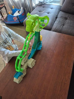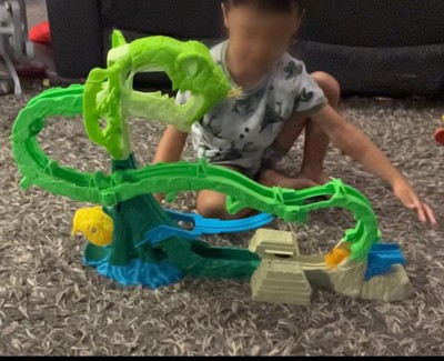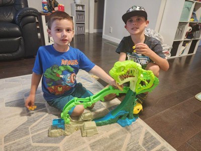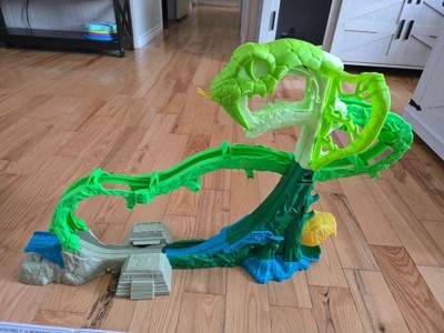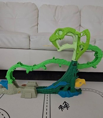 [This review was collected as part of a promotion.] A unique track for any car fanatic kid in your life. Its good track to have on display as it is quite heavy but different from most tracks so I find him coming back to play with it. The track has an option to lift the track so the car flys out the snakes mouth which my son thought was highly entertaining. Cons, track is loud when turned on and I find the trucks get stuck a lot. All in all we enjoyed this track and would recommend.