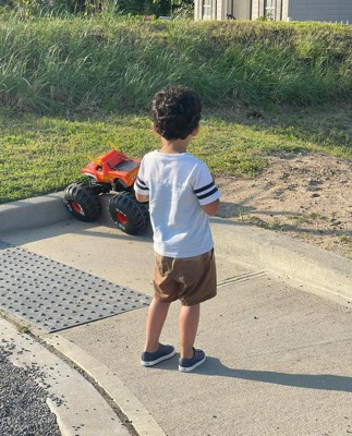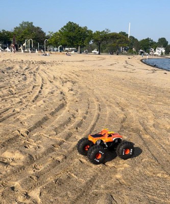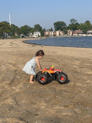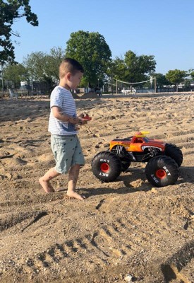 We bought it as a housewarming gift for friends who got a house on the beach. It was HUGE when it arrived - definitely bigger than expected. The kids couldn't wait to try it. We were happy to learn that it comes pre-charged (enough for everyone to try it out). It goes fast and drove well on the sand on their beach. I loved how lightweight it is so that even toddlers could carry it from one spot to the next. The remote is very easy to use (even our 2yo was able to steer the truck). All in all, amazing product and a wonderful gift. We are looking forward to getting the Grave Digger and race them this summer!