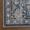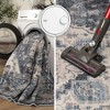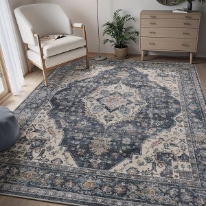 This oriental-style rug showcases a bold central medallion on a distressed navy background, framed by intricate floral and vine patterns in ivory, beige, rust, and soft blue. Its deep tones and vintage-inspired design add an elegant, antique touch that suits both classic and modern spaces. Crafted with an ultra-soft, liquid-resistant surface and non-slip backing, it’s perfect for homes with kids and pets. The low 0.38" pile height makes it ideal for high-traffic areas like living rooms or hallways, and it’s machine-washable for easy care.