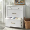 Create an inviting environment adding extra storage space with the Monza Modular 3 Drawer Cabinet by Lifestorey. This cabinet is part of the Monza Collection, designed to offer flexible and multi-functional storage space for the dining room, home office or kitchen. The top drawer is a convenient place for flatware, utensils, or office supplies, while the two large lower drawers are ideal for storing linens, cookware, kitchen essentials, books and more. The cabinet features a faux marble top with brass handles and knobs for an added level of sophistication. Customize your space and storage requirements with other Monza cabinet components (sold separately) to create the best configuration that suits your needs. Constructed of MDF, in a white finish with a modern inspired farmhouse design.
