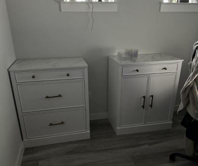 - Features a faux marble top with three (3) drawers
