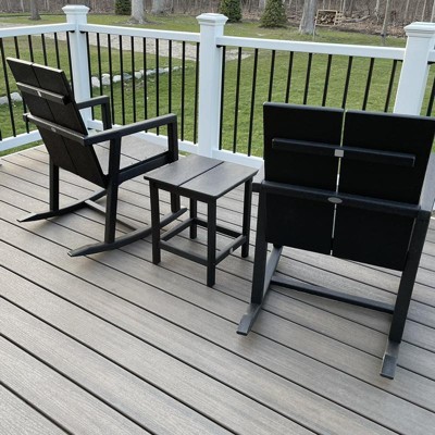Modern looking rockers with a smaller footprint. Had my eye on the Polywood Vineyard Deep Seating Rocking Chair but they were a little too large and $$$ for our space. Wanted something more sleek than the traditional rocking chair, and not wicker nor wood. These were a great alternative. Still a bit pricey but more affordable through Target and still have the 20 year Polywood warranty, and is maintenance-free. The chair doesn’t tip forward for us (adults) as mentioned in other reviews but I can see that happening with younger kiddos if they concentrate their weight on the front edge of the seat. We added lumbar pillows. Wish it came with seat and back cushions like the Vineyard. Install was not too bad; would be easier with two people but I did it alone. Instructions are ok, but seem kind of out of order when working alone. I did have to unscrew one side of the seat boards as the seat assembly just didn’t fit on the bottom cleat of the back assembly without doing so m. Not sure if that was a manufacturer error or user error. Ordered two and both came with one defective arm, was able to put one together using the two good arms, and customer service was able to get me two replacement arms pretty quickly. Polywood customer service is great. Glad to have these and the matching table to refresh our front porch.