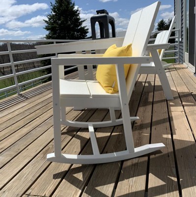 Modern looking rockers with a smaller footprint. Had my eye on the Polywood Vineyard Deep Seating Rocking Chair but they were a little too large and $$$ for our space. Wanted something more sleek than the traditional rocking chair, and not wicker nor wood. These were a great alternative. Still a bit pricey but more affordable through Target and still have the 20 year Polywood warranty, and is maintenance-free. The chair doesn’t tip forward for us (adults) as mentioned in other reviews but I can see that happening with younger kiddos if they concentrate their weight on the front edge of the seat. We added lumbar pillows. Wish it came with seat and back cushions like the Vineyard. Install was not too bad; would be easier with two people but I did it alone. Instructions are ok, but seem kind of out of order when working alone. I did have to unscrew one side of the seat boards as the seat assembly just didn’t fit on the bottom cleat of the back assembly without doing so m. Not sure if that was a manufacturer error or user error. Ordered two and both came with one defective arm, was able to put one together using the two good arms, and customer service was able to get me two replacement arms pretty quickly. Polywood customer service is great. Glad to have these and the matching table to refresh our front porch.