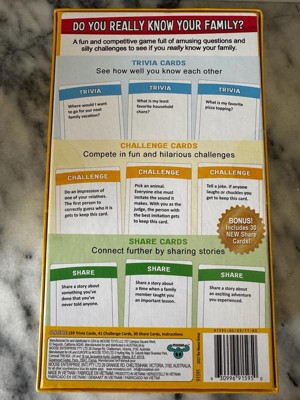 "Do You Really Know Your Family?" You'll find out when you and your family get together and play this easy and fun card game! Do You Really Know Your Family? - BONUS EDITION now has 30 brand-new "Share Cards" allowing this fun family game to open up even more opportunities for heartfelt, funny, or unexpected stories. See who really knows the family best as you answer fun trivia questions about each other! Create hilarious family memories as you perform and complete silly challenges together to be the first player to collect 15 game cards! "Do You Really Know Your Family? - BONUS EDITION" is the perfect game for families with kids ages 8 and up, teens and adults. So easy to learn and play, "Do You Really Know Your Family? - BONUS EDITION" now contains 3 sets of playing cards - 159 Trivia Question Cards, 41 Challenge Cards and 30 Bonus “Share” Cards. Draw a Trivia Card and read the question about yourself out loud. The first person to guess the answer you are thinking of wins the card! Challenge Cards have silly and fun challenges and games for the family to perform together. Share Cards - draw a Share Card and it’s your time to tell a story inspired by the prompt. Share the laughs as you all learn things about each other that you never knew! It's wholesome fun for everyone. "Do You Really Know Your Family? - BONUS EDITION" is an ideal game for family game night as well as making a great party game. With over 200 different cards in the box, there's plenty to learn about everybody and heaps of silly challenges to perform. Great for 3 to 8 players.