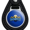 - QUALITY MATERIAL: Our durable round keychain is crafted from leather with a glossy resin-topped emblem featured design shown on one side. Approximately 1.5" (3.8cm) x 2.5" (6.4cm) in overall size, emblem is 1" (2.5cm)..