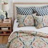 The Moreno Comforter Set by Levtex Home has a richly detailed tapestry-like feel. Offered in red, blue, grey, gold, teal, this design will immediately transform your bedroom. Made with a soft, luxurious cotton, this comforter set features a gorgeously detailed, rich printed damask. It has a red, blue, grey, gold, teal on the front and a small repeating motif on a blue ground on the reverse. It is filled with a hypoallergenic 100% polyester filler. The Moreno Comforter Set is machine washable and includes the comforter and pillow cases. Enjoy this for years to come!