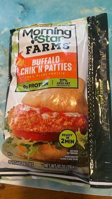 [This review was collected as part of a promotion.] These Morning Star Farms Buffalo chick'n patties are crispy and full of flavor and they have a kick of spicy to them. You would never know they were a vegetarian food. The packaging is easy to open and close in it resealable pouch. Just pop them in airfryer at 400 degrees for 15 minutes and enjoy. I would repurchase these and reccomend.