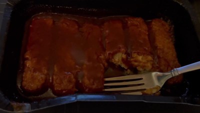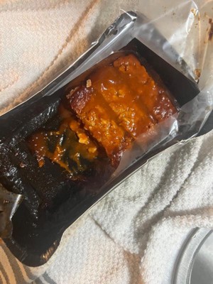 [This review was collected as part of a promotion.] Rich, spicy, flavorful sauce coating a bread sized vegan riblet patty that has good mouthfeel. Microwaved well for a quick easy dinner. Easy to read packaging!