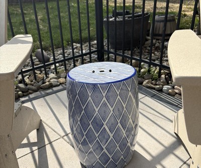 A navy-on-white diamond pattern gives this ceramic garden stool an exotic flair. Its simplified shape makes it the perfect modern accent table. Try a pair in front of a sofa, or use them for drinks or plants indoors or out.