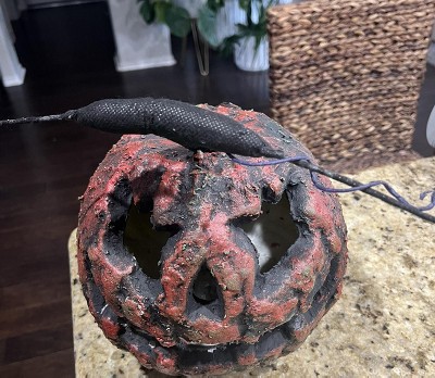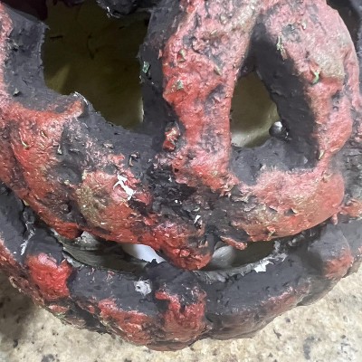 This scary pumpkin is ready to lure unsuspecting victims to their doom! A creep-tastic pick for indoor or outdoor Halloween displays and haunted houses, this rotten jack-o’-lantern shines bright with eerie colors from within, speaks and laughs maniacally when activated. Care Instructions: Hand wash cold water with mild soap. Tumble dry low. For best results hang or lay flat to dry.