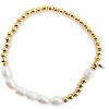 - Beads: 4mm 18k gold-plated PVD round & tube beads (plated over stainless steel) Length: 6.75"" | Stretches to fit up to 7.5" Fit: Comfortable elastic stretch band Materials: Waterproof, sweatproof, tarnish-resistant 18k gold PVD over stainless steel, glass spacer bead